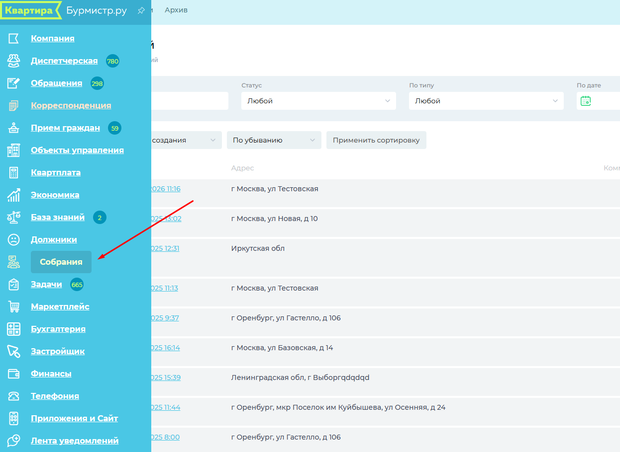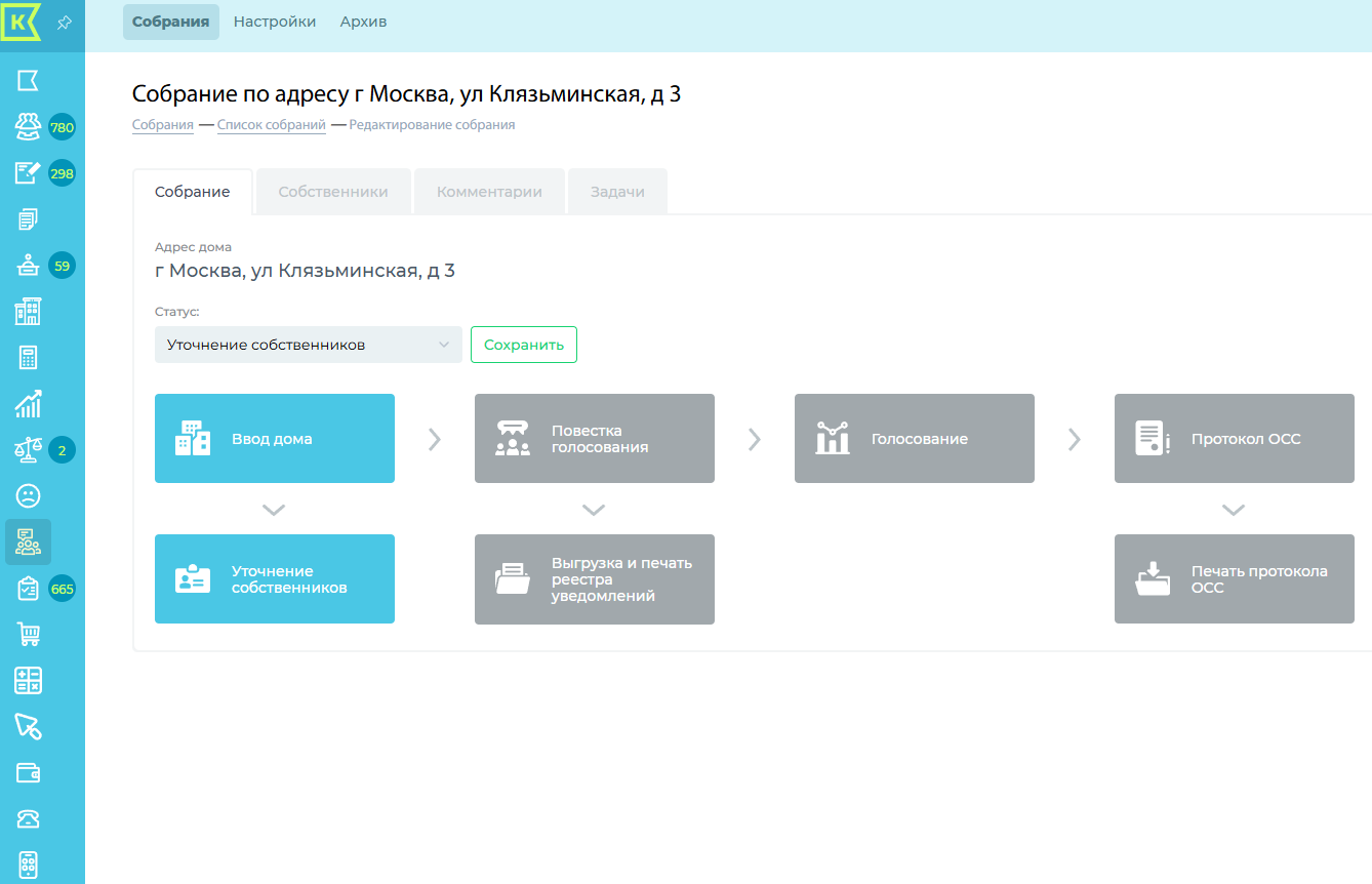 Итак, чтобы создать и провести общее собрание собственников помещений или общее собрание членов ТСЖ (ЖСК) заходим в модуль "Собрание".