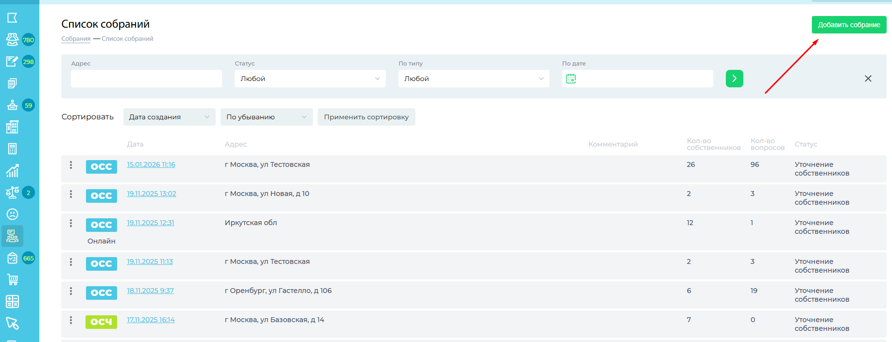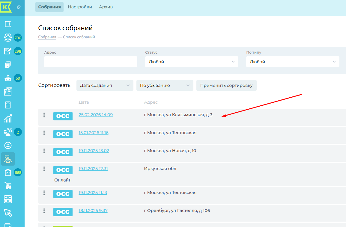 На данной странице вы видите список всех созданных собраний. Обратите внимание, на иконки ОСС и ОСЧ, которые обозначают соответственно