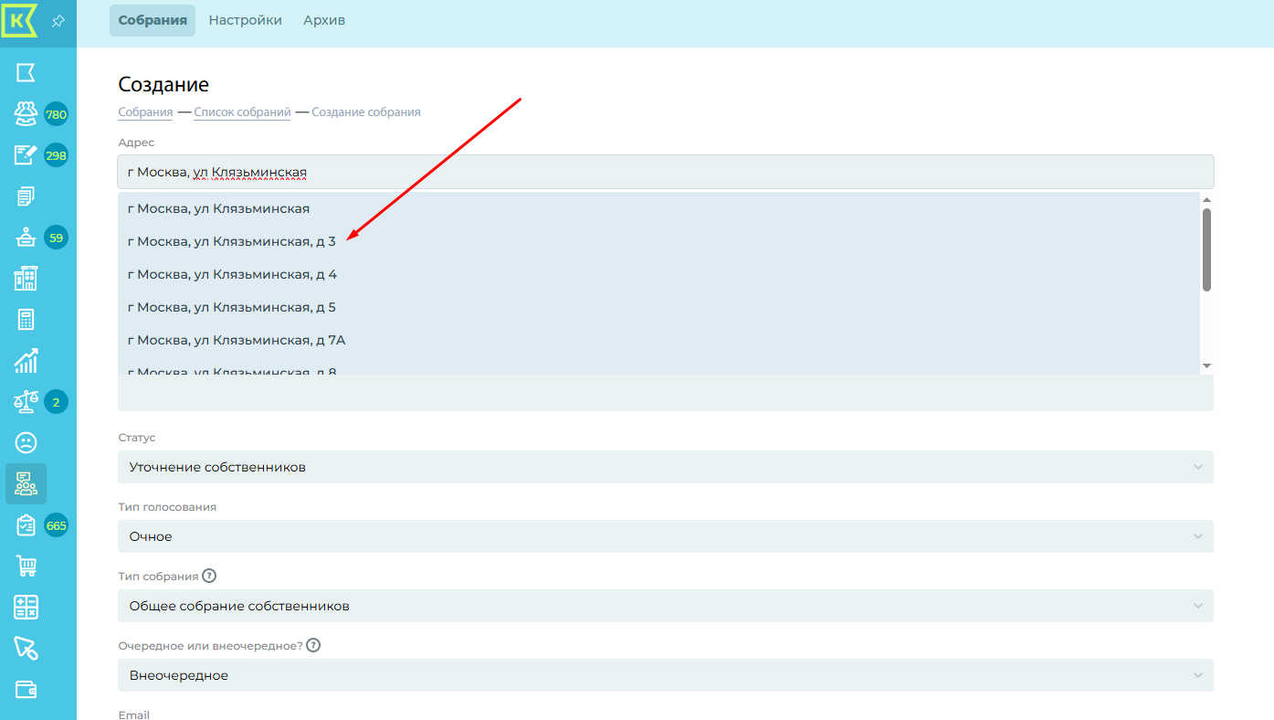 При добавлении собрания выбираем адрес дома из базы ФИАС (база постоянно обновляется).