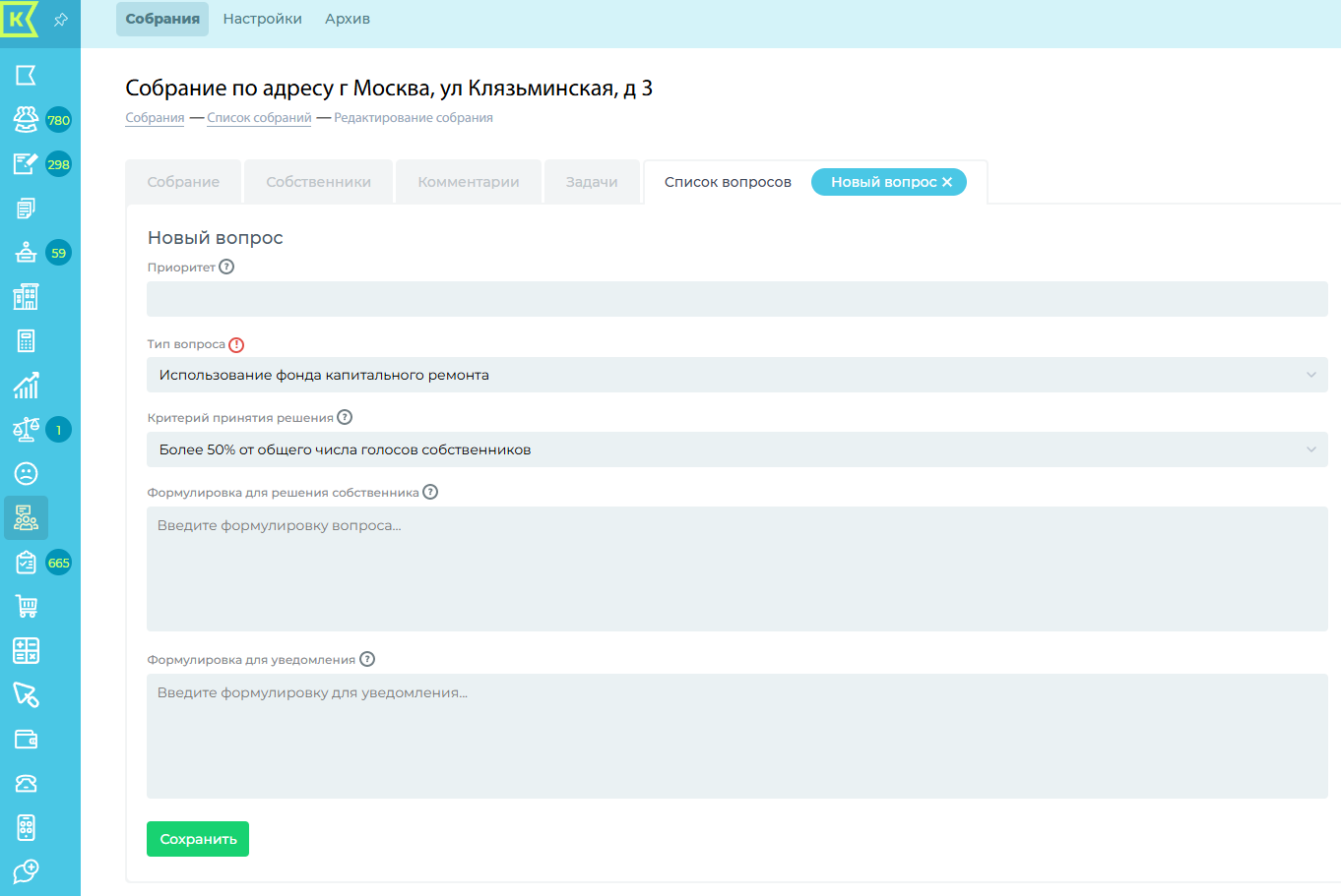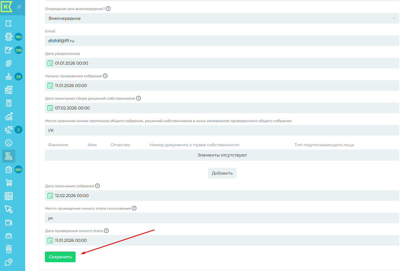 Далее заполняем все поля для уведомления (используя подсказки) и нажимаем "Сохранить". После видим созданное собрание в списке всех собраний.