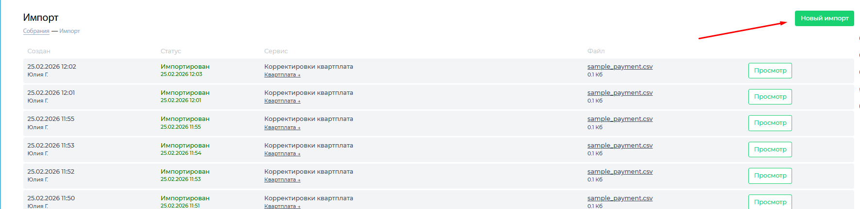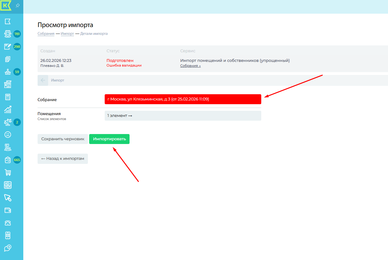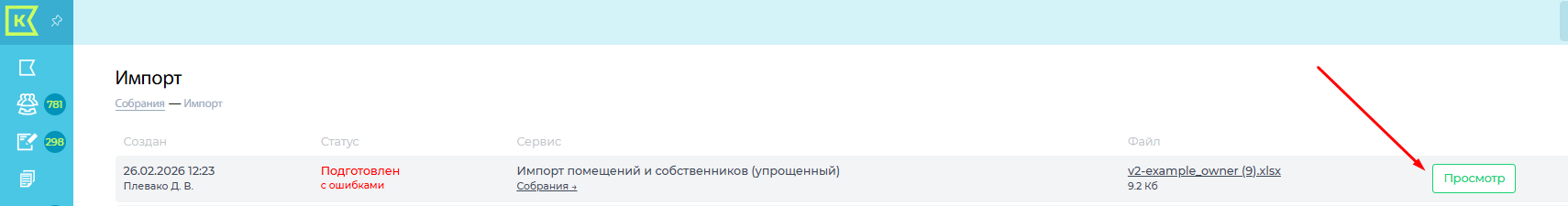 Шаблон подготовлен, статус "с ошибками", паниковать рано. Далее заходим в "Просмотр" и выбираем нужное собрание, нажимаем "Импортировать"