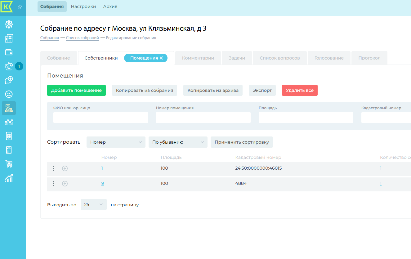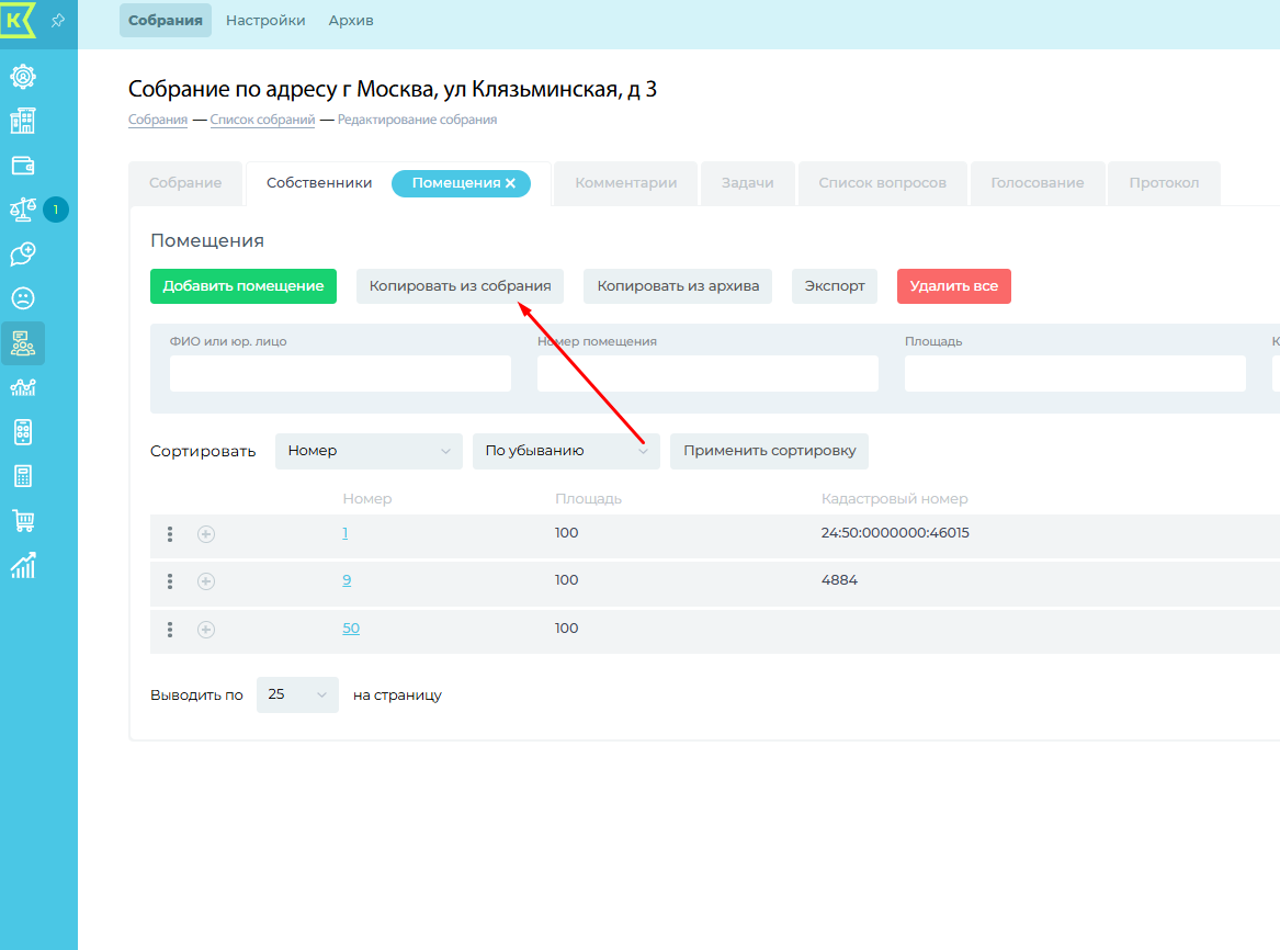 Заходим во вкладку "Помещения", нажимаем кнопку "Копировать из архива". Выбираем нужное собрание в списке, нажимаем сохранить