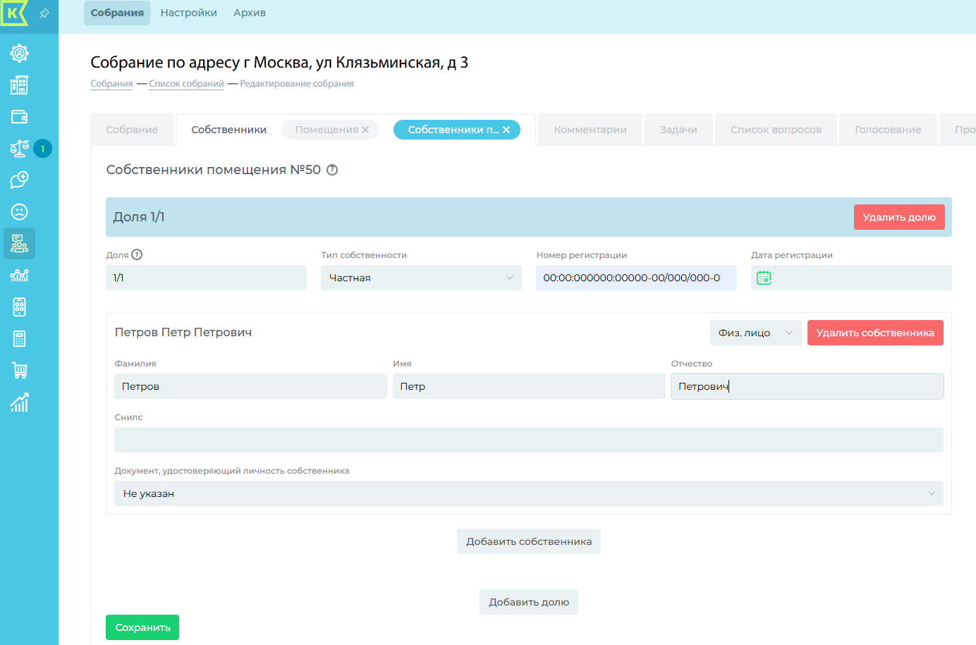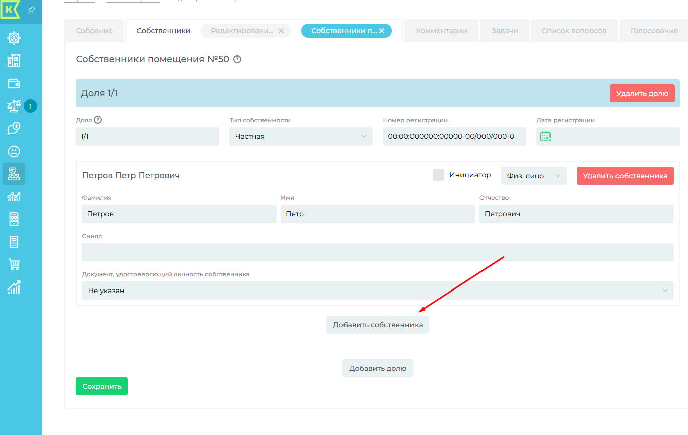 На данной вкладке можно добавить собственников: