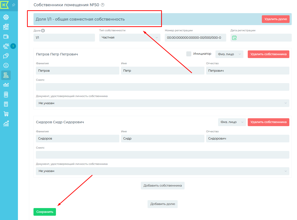 Меняем долю у первого собственника и добавляем второму по 1/2, заполняем данные по второму собственнику и нажимаем "Сохранить"