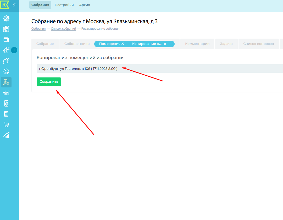 Заходим во вкладку "Помещения" Нажимаем на кнопку "Копировать из собрания"/ Выбираем из всплывающего списка собрание. Сохраняем.