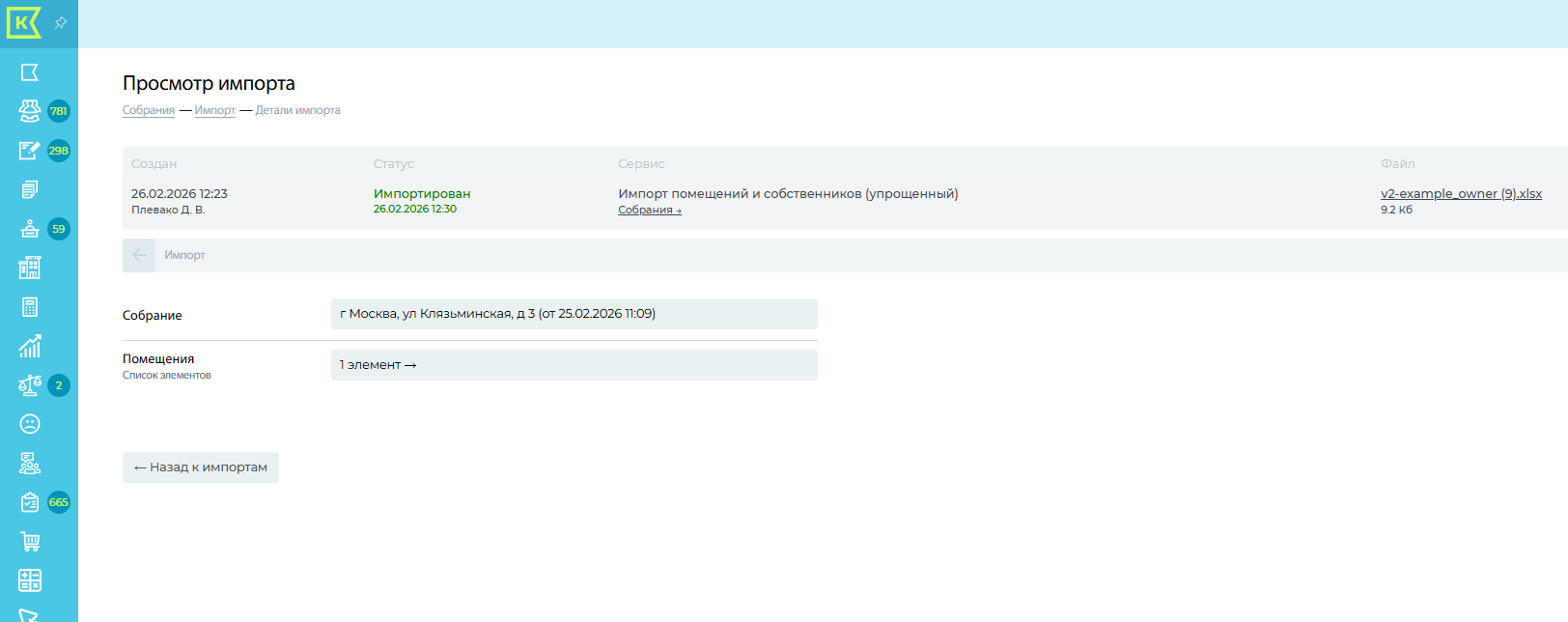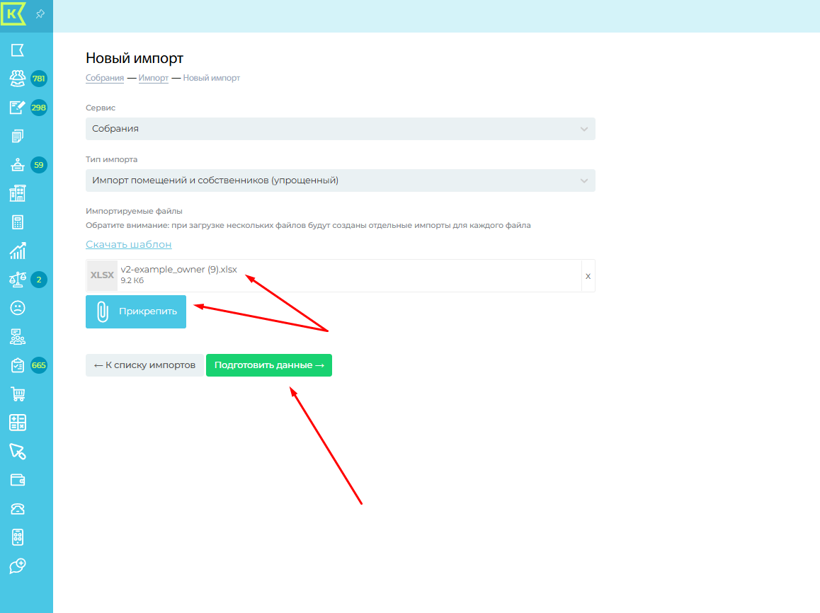 Нажимаем на кнопку "Импорт" - "Новый импорт". В поле "Тип импорта" выбрать "Импорт собственников". Скачиваем и заполняем шаблон.