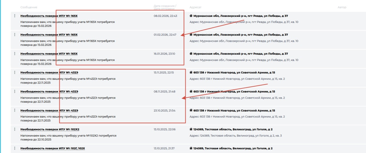 Тогда Система будет знать Дату следующей поверки прибора. Исходя из этой даты Система автоматически сформирует и отправит жителю 3 уведомления, что нужно поверить прибор учёта (за 30 дней, за 14 дней, за 7 дней).