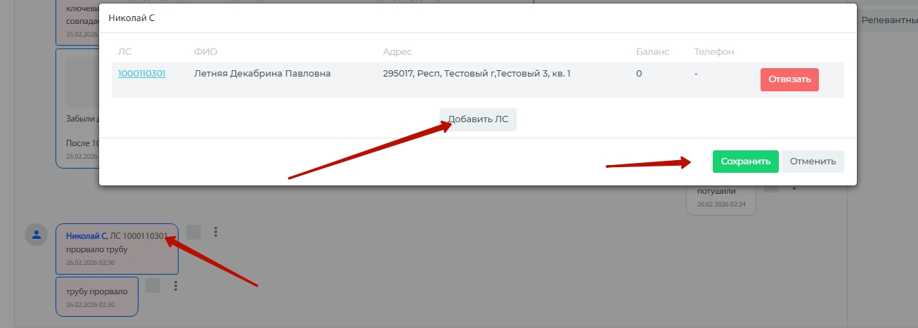 Также можно привязать сообщения к конкретному лицевому счёту в CRM-системе, если вы идентифицировали вашего абонента. Для этого нажмите на сообщение и у вас появится окно, с помощью которого можно привязать или отвязать лицевой счёт