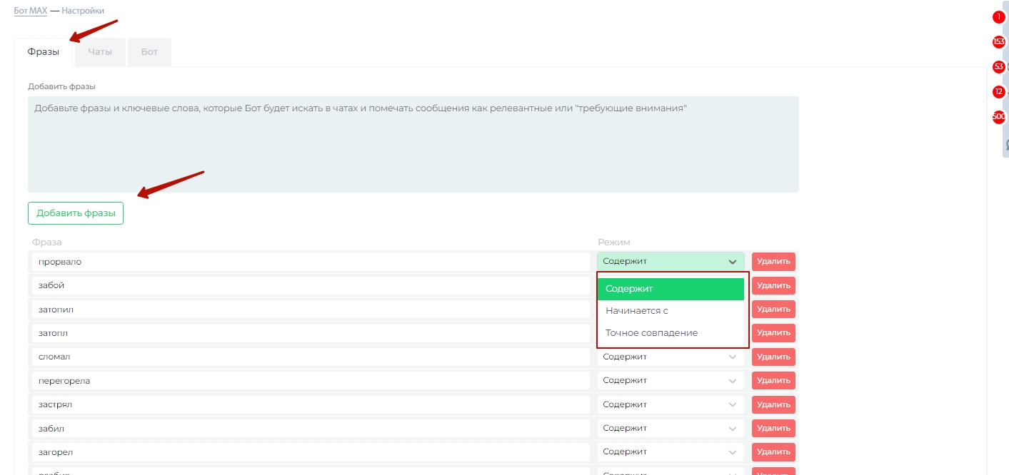 5. Далее необходимо перейти на вкладку Фразы и заполнить ключевые слова, по которым бот будет искать совпадения в вашем общедомовом чате.
