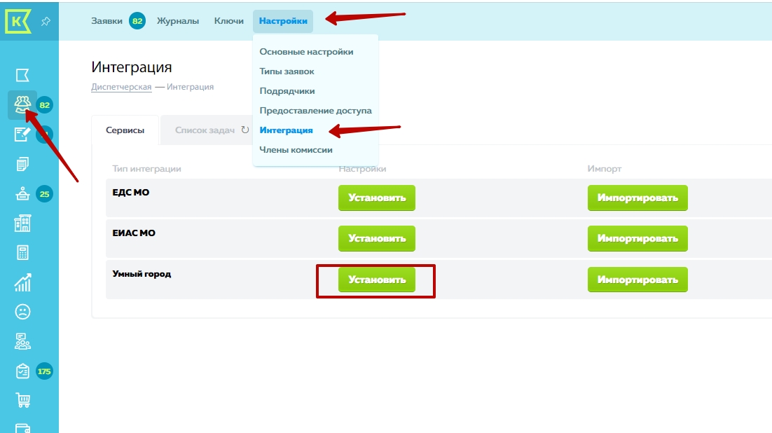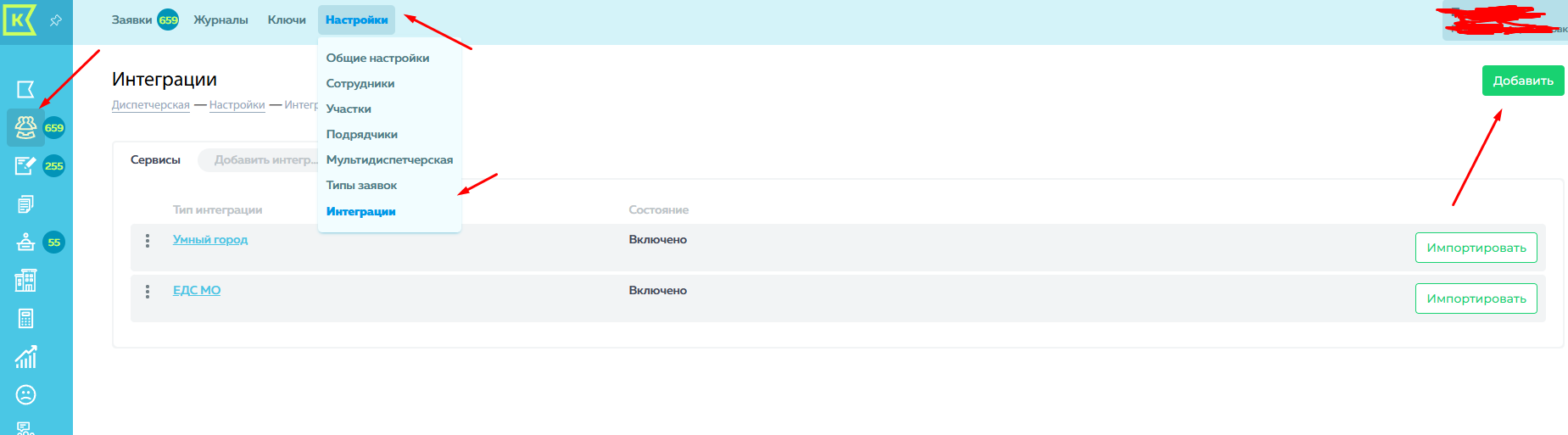 2. Перейти в модуль Диспетчерская - Настройки - Интеграция - Добавить