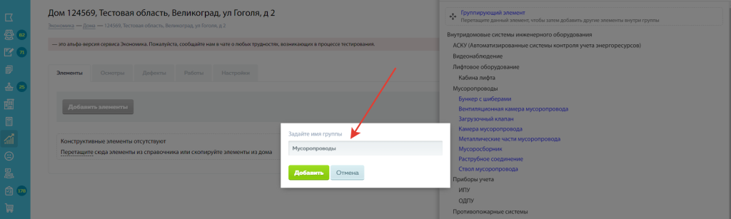 К примеру нам надо добавить Мусоропроводы - хватаем их и перетаскиваем в рабочее поле. Если вы перетаскиваете сразу группу элементов - система спросит вас нужно ли переименовать группу (переименовать можно и впоследствии).