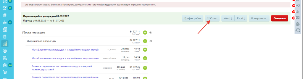 На странице утвержденного перечня работ есть кнопка "Отчет"