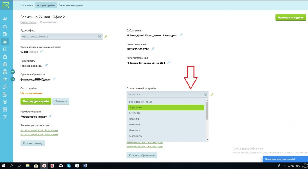 Затем назначаем ответственного за прием, исходя из причины обращения.
