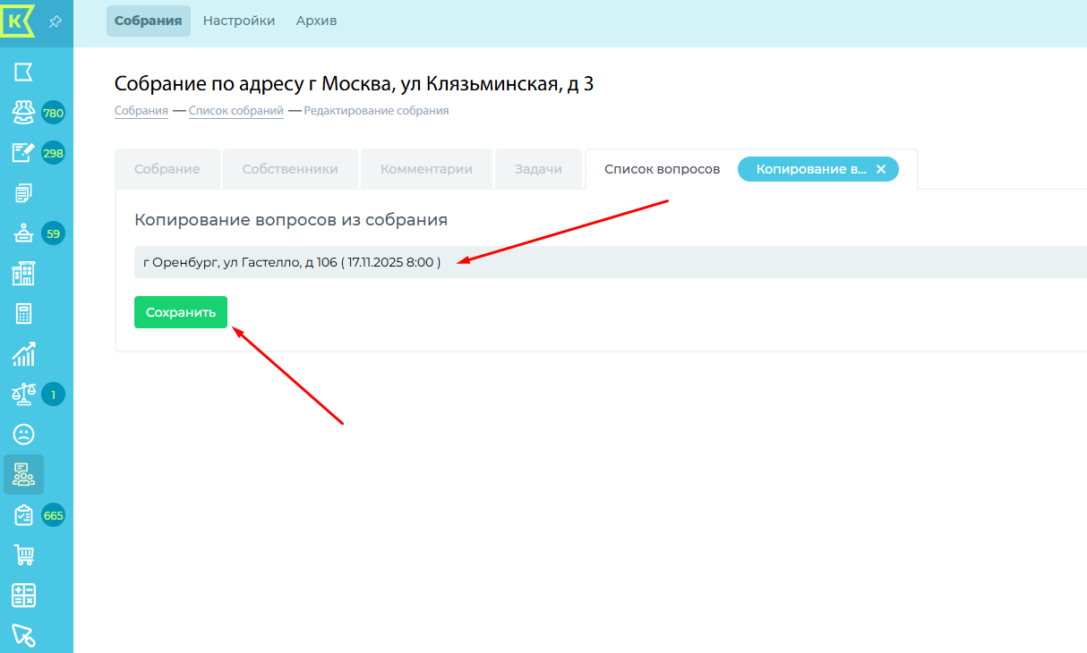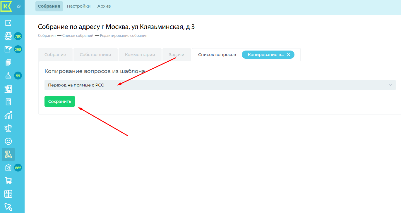 2. Скопировать вопросы из ранее вами проведённого собрания