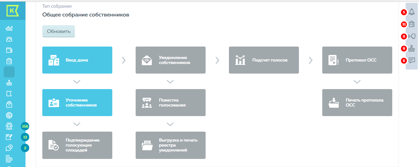 Итак, чтобы создать и провести общее собрание собственников помещений или общее собрание членов ТСЖ (ЖСК) заходим в модуль "Собрание".