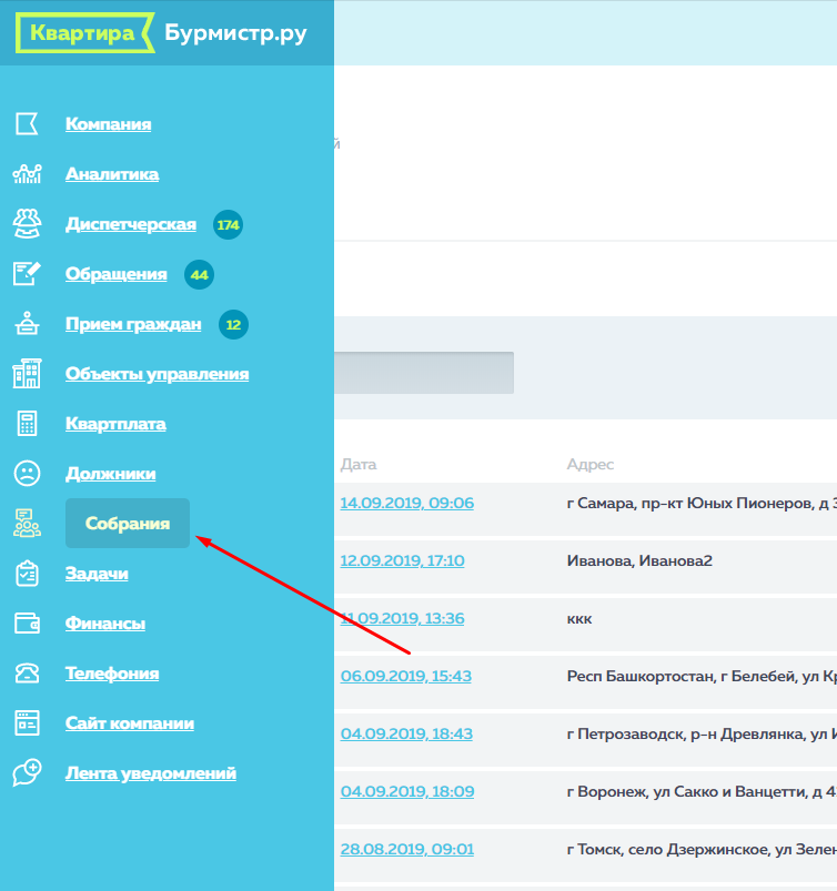 Для добавления собрания нажимаем кнопку "Добавить собрание"