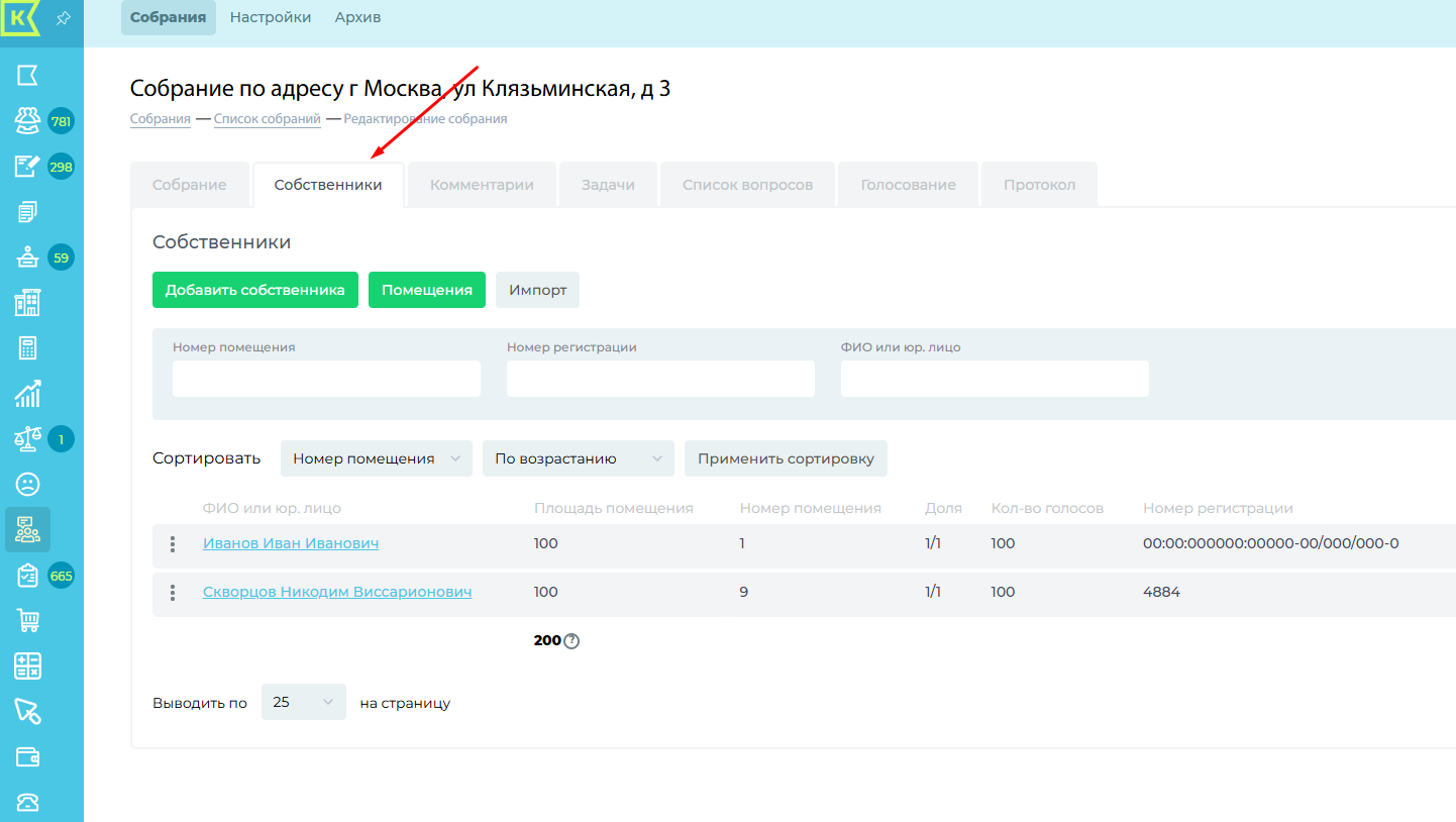 Добавление списка собственников
