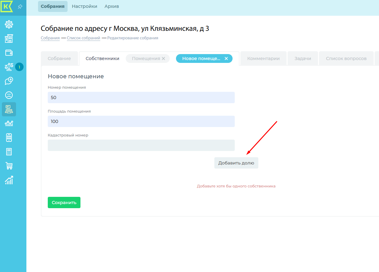 На данной вкладке можно добавить собственников: