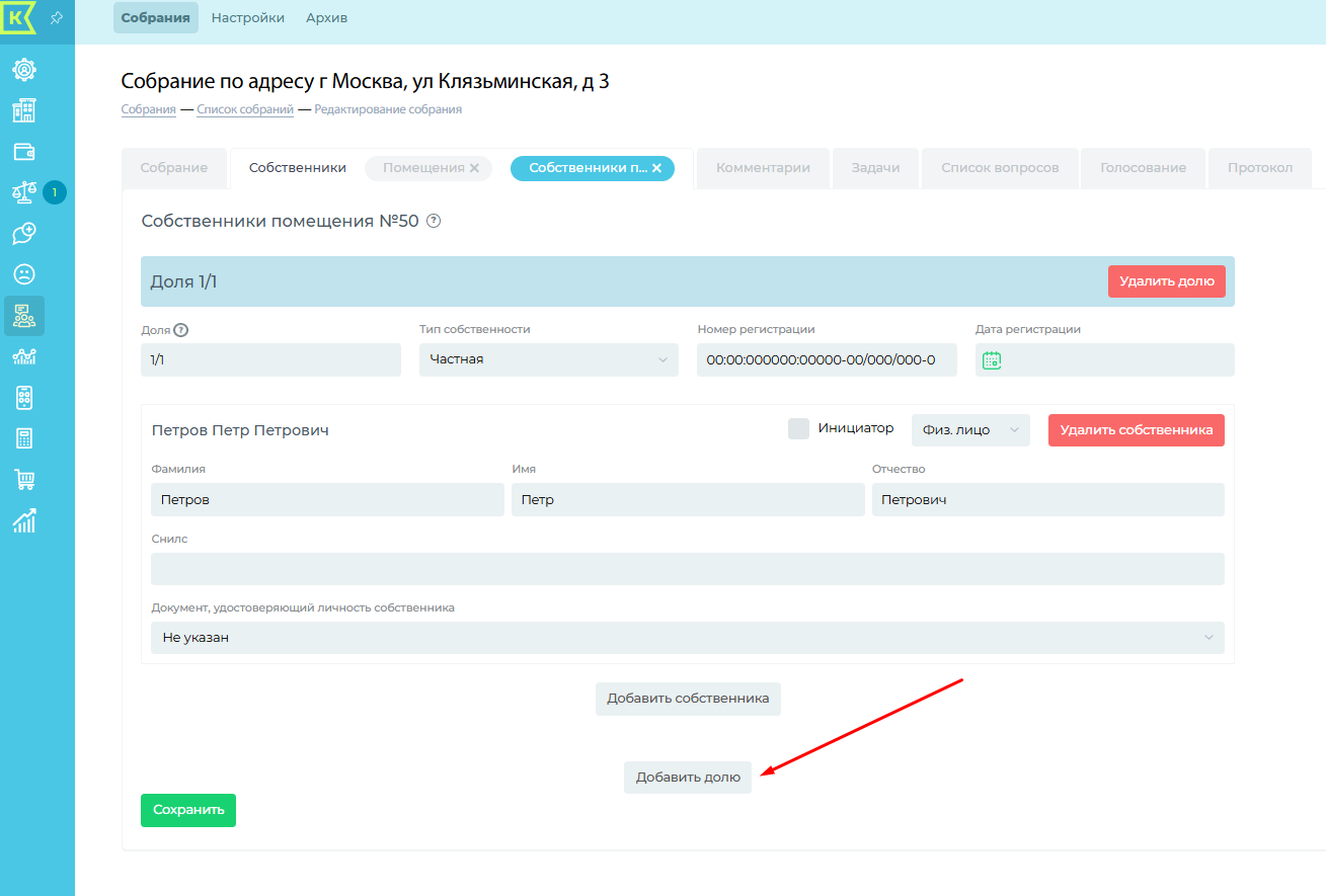 Для добавления долевой собственности, заходим в редактирование ранее заведенного собственника и нажимаем "Добавить долю"