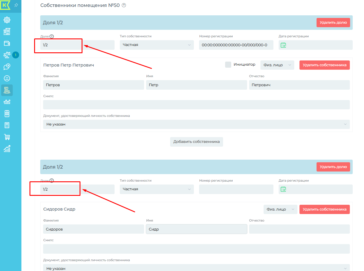 Меняем долю у первого собственника и добавляем второму по 1/2, заполняем данные по второму собственнику и нажимаем "Сохранить"