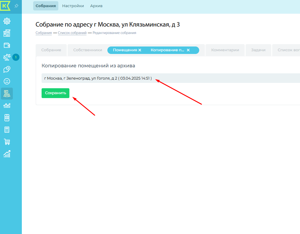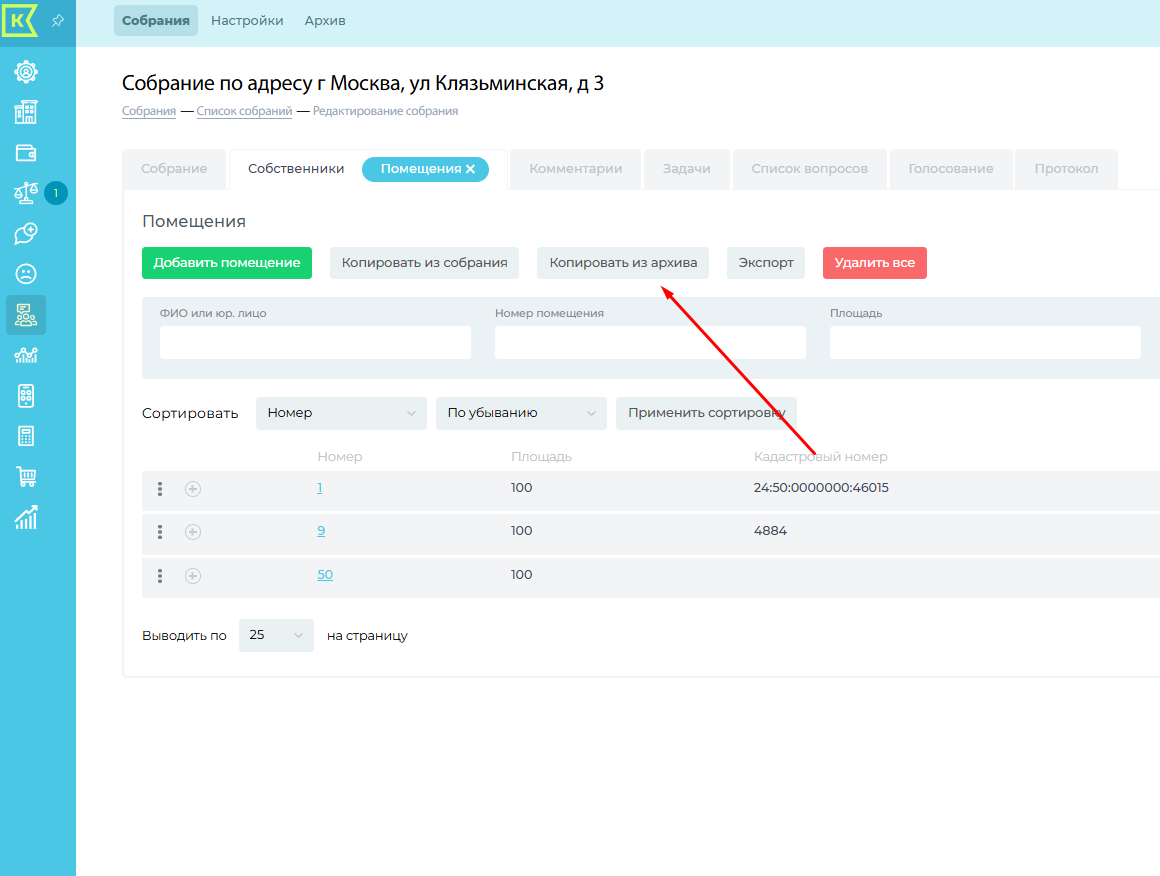 Заходим во вкладку "Помещения", нажимаем кнопку "Копировать из архива". Выбираем нужное собрание в списке, нажимаем сохранить