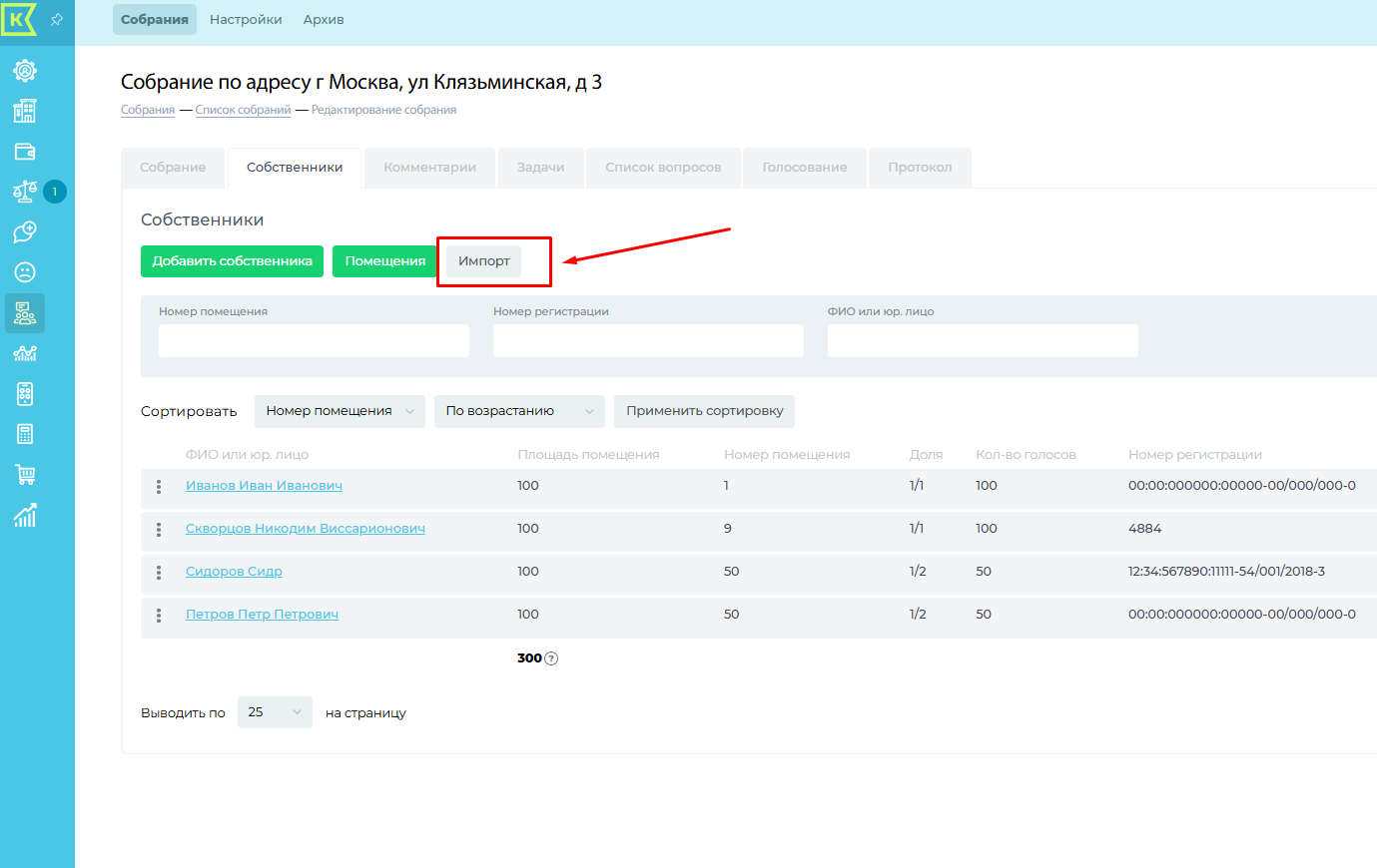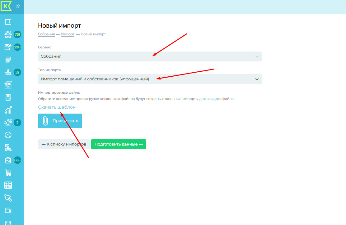 Нажимаем на кнопку "Импорт" - "Новый импорт". В поле "Тип импорта" выбрать "Импорт собственников". Скачиваем и заполняем шаблон.