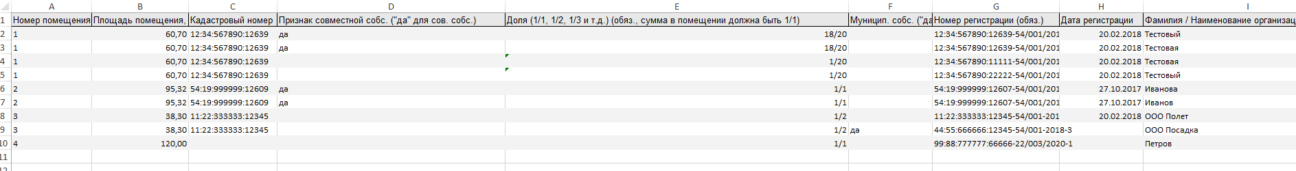 Ячейки "Площадь помещения" должны быть в числовом формате, все остальные в текстовом формате. Обратите внимание на столбец "Признак совместной собственности". Если у собственников общая совместная собственность, указываем их в разных строках с одним номером помещения, ставим в столбце признак "Да", доли прописываем 1/1 у каждого. Для муниципальной собственности так же предусмотрен признак "Да"
