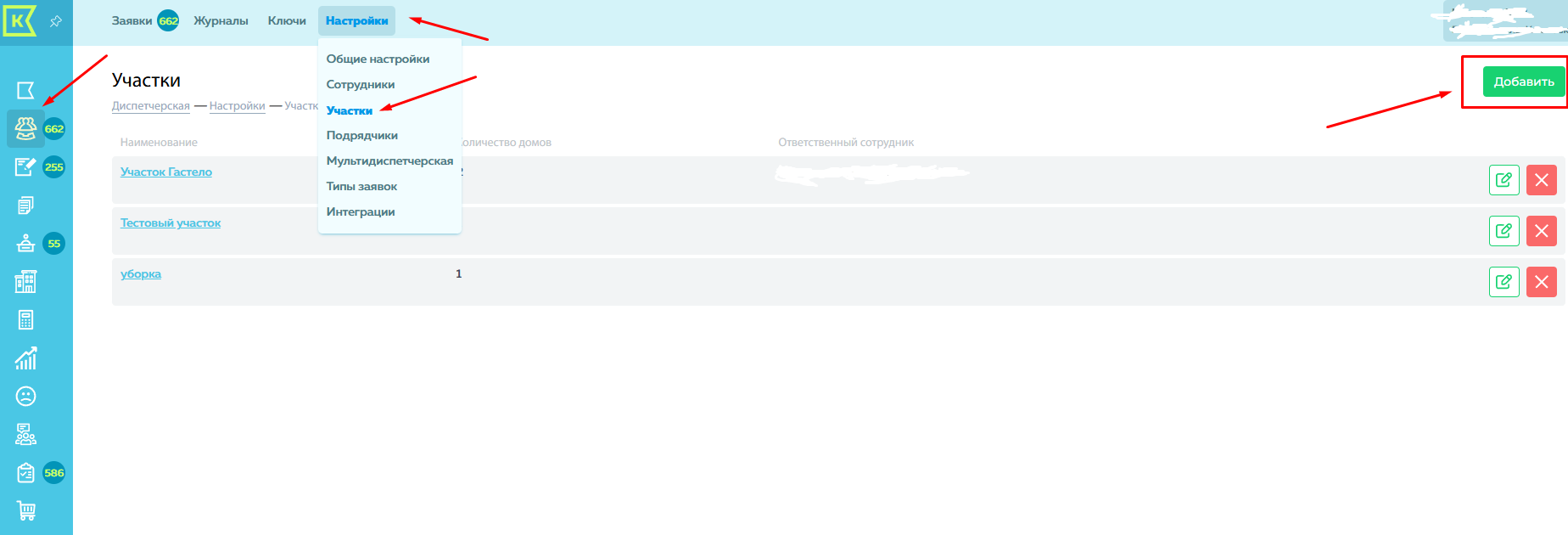 Для создания заходим в модуль "Диспетчерская" - Настройки - Участки