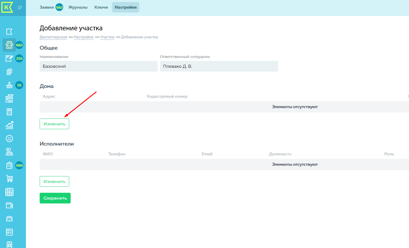 Далее при необходимости привязываем нужных сотрудников к этому участку по такой же аналогии как и дома, нажимаем Изменить