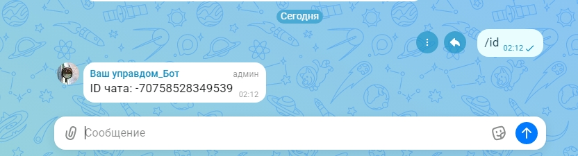 2. В чате пишете команду /id. Бот автоматически ответит и сообщит идентификатор чата, который нужно добавит в CRM-систему. Копируем этот идентификатор.