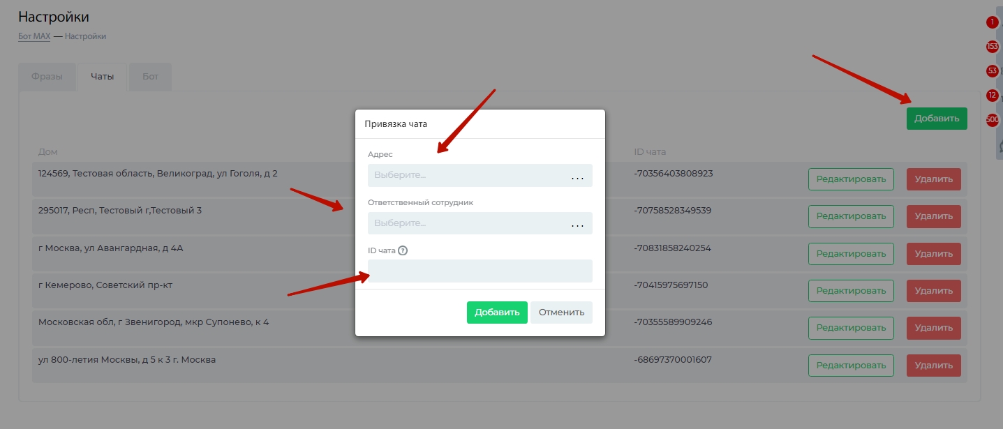 Добавляем чат, выбрав дом, указав при желании справочно ответственного сотрудника, прописав идентификатор чата, который на предыдущем этапе автоматически присвоил чату наш бот.