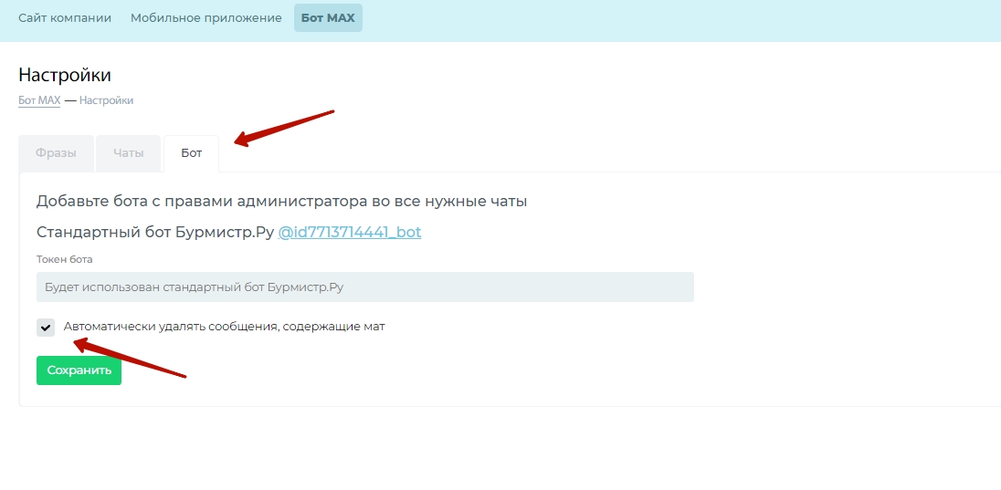4. На вкладке Бот можно включить или отключить функцию автоматического удаления ненормативной лексики из общедомового чата