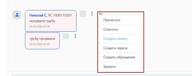 - Создать заявку, задачу, обращение. Позволяет на основании сообщения в чате создать соотвествующую сущность в нужном вам модуле (Диспетчерская, Задачи, Обращения), чтобы в дальнейшем нужный отдел решил проблему.