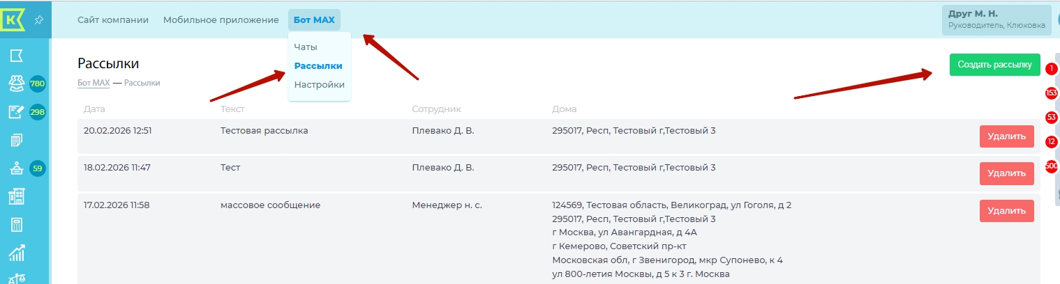 1. Переходим по следующему пути: Приложения и сайт - Бот MAX - Рассылки - Создать рассылку.