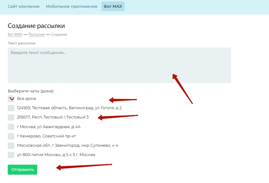2. Заполняем текст рассылки, выбираем дома, в чаты который нужно отправить сообщение.
