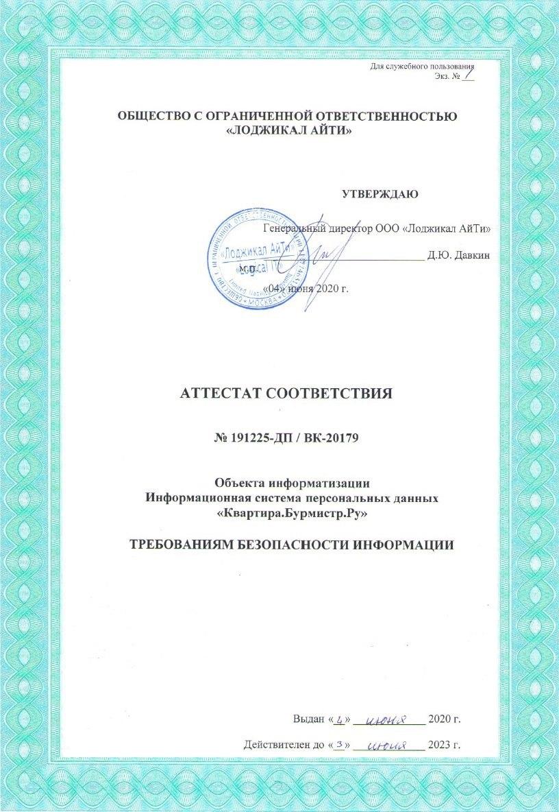 Кроме того наша CRM-система «Квартира.Бурмистр.Ру» прошла процедуру аттестации (третий уровень защищенности) и получила аттестат соответствия CRM-системы требованиям действующего законодательства в части персональных данных.