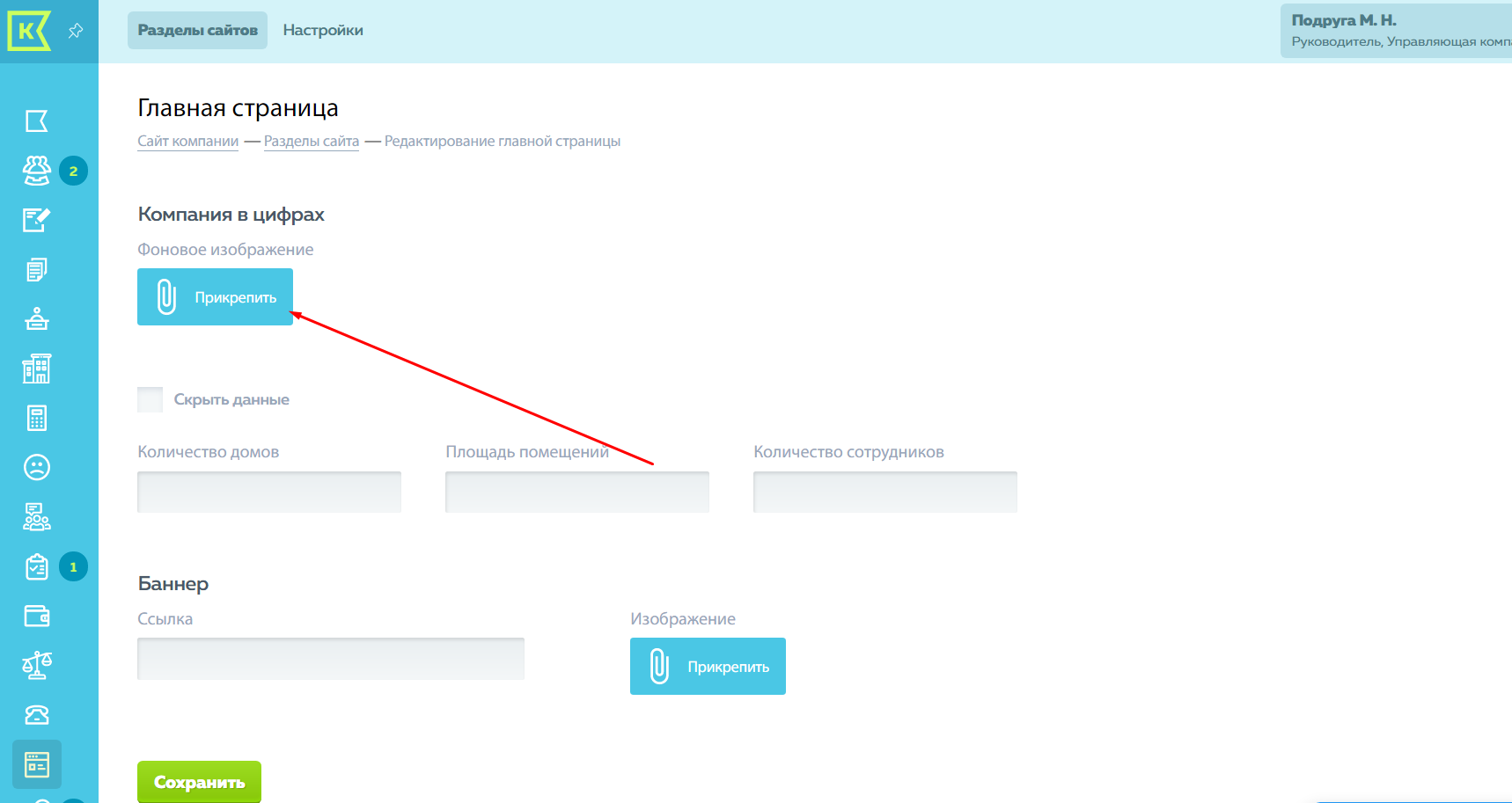 Здесь же можно скрыть данные по компании: количество домов, площадь помещений и количество сотрудников. В этой же вкладке можно разместить баннер. Размер должен быть 1520Х214. И не забудьте поставить ссылку.