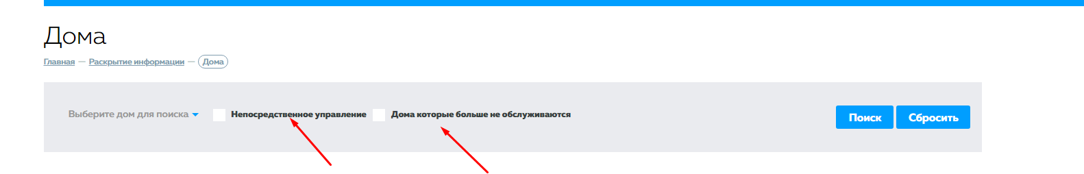 На сайте также отображаются дома, которые вы больше не обслуживаете и которые заархивированы в CRM-ке, а также дома на непосредственном управлении (чтобы такие дома появились на сайте вам необходимо внутри дома проставить тип управления, выбрав "непосредственное управление"). Найти архивные и непосредственные дома можно в разделе "дома" на сайте.