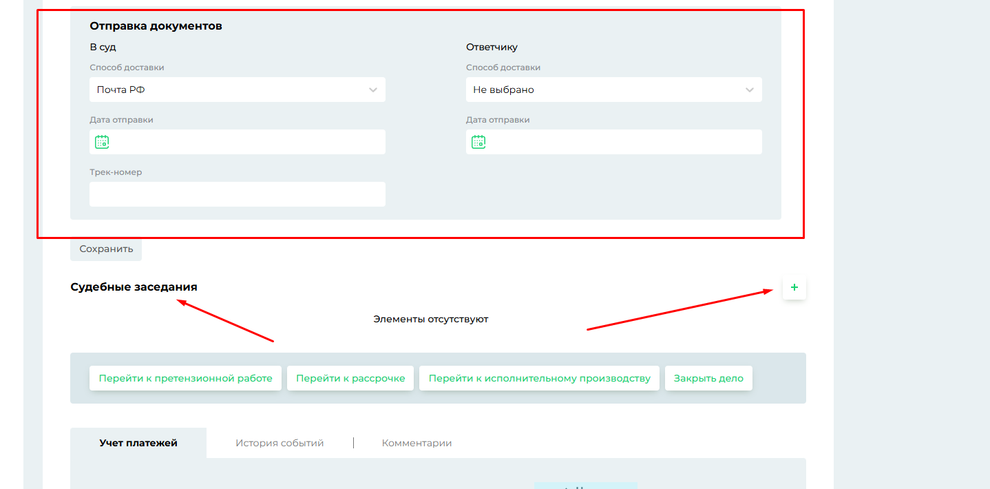 В этапе можно отразить способ отправки документов ответчику или в суд с датами и отслеживанием трек номера, если выбрано почтой РФ. А так же добавить информацию по судебному заседанию