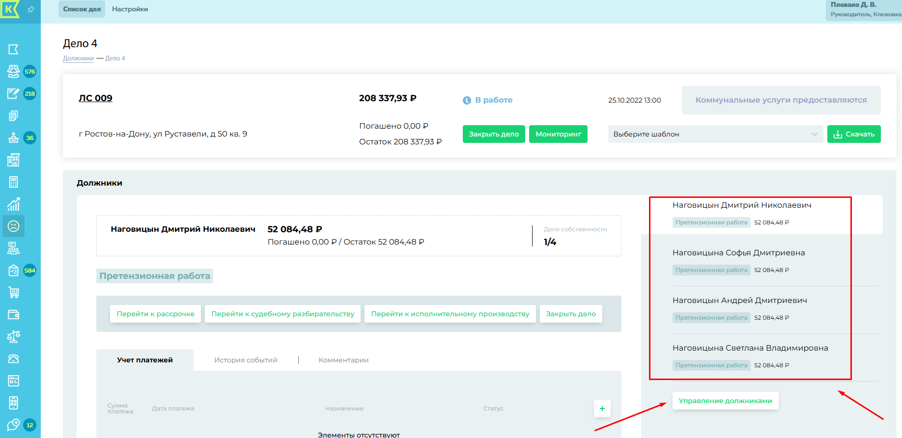Важно! В новой версии можно вести дела не только по собственнику (держателю лицевого счета), а по каждому отдельно с учетом долей в этом помещении. Если они добавлены в паспортный стол с периодами владения, они отобразятся автоматически в деле