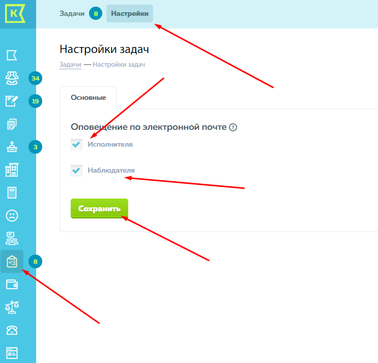 Способы оповещения исполнителю,наблюдателю или инициатору можно настроить во вкладке Настройки - Общие настройки. Не забываем Сохранить.