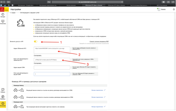 В списке подключенных сервисов Телефонии в CRM появится ваш сервис. Нас интересуют указанные строки и их надо перенести в личный кабинет Дом.ру